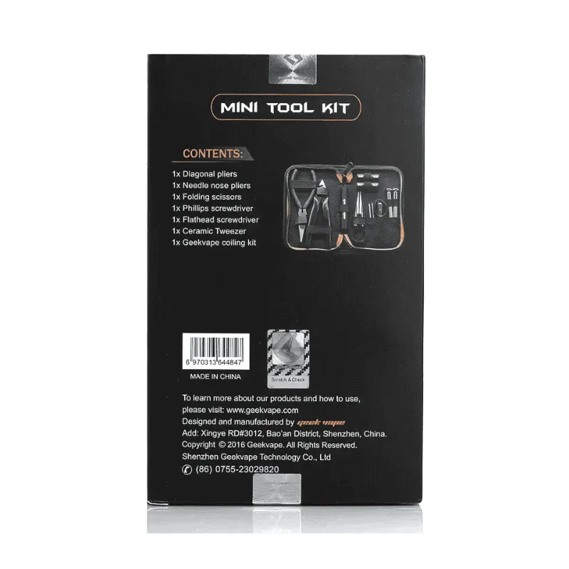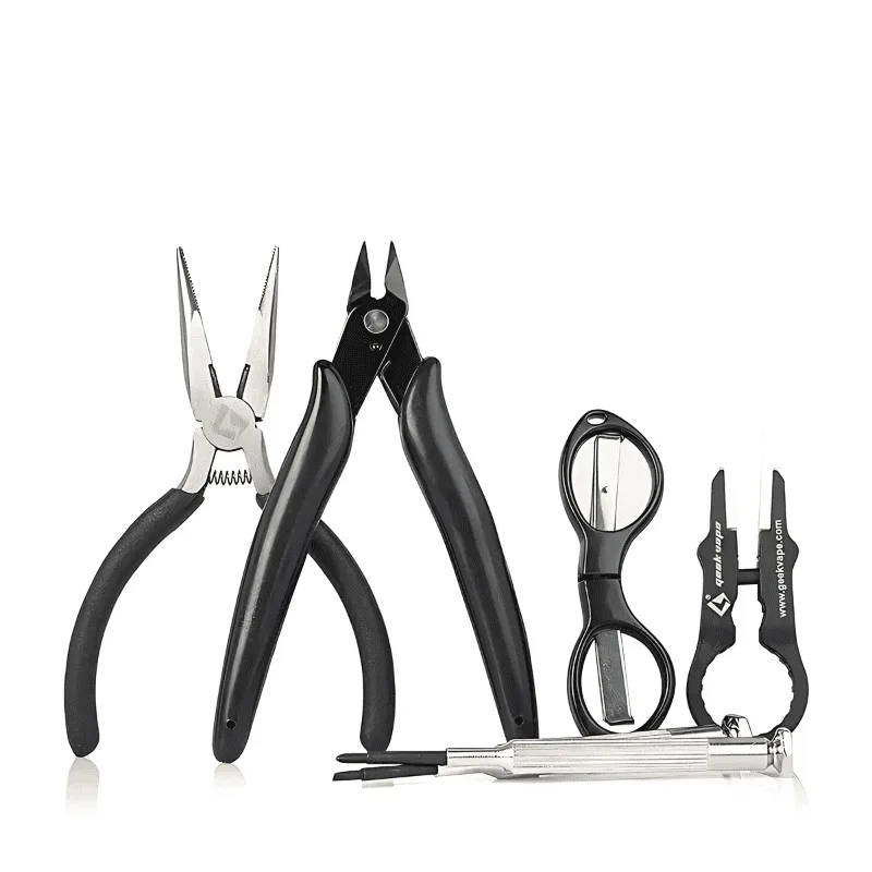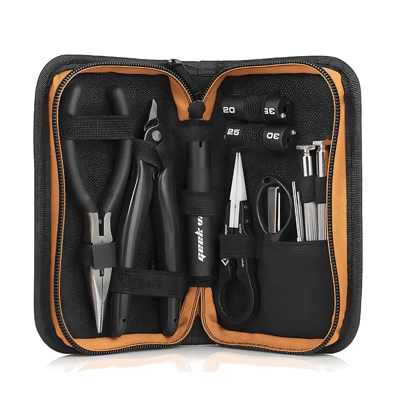 El GeekVape Essential Tool Kit es un conjunto de herramientas esenciales para los usuarios. El kit de herramientas incluye alicates diagonales, alicates de punta, tijeras plegables, un destornillador Phillips de 2,5 mm, un destornillador de cabeza plana de 2,5 mm, pinzas de cerámica y un kit de bobinado Geekvape con varillas de bobinado de 2m, 2,5 mm, 3,0 mm y 3,5 mm de diámetro.