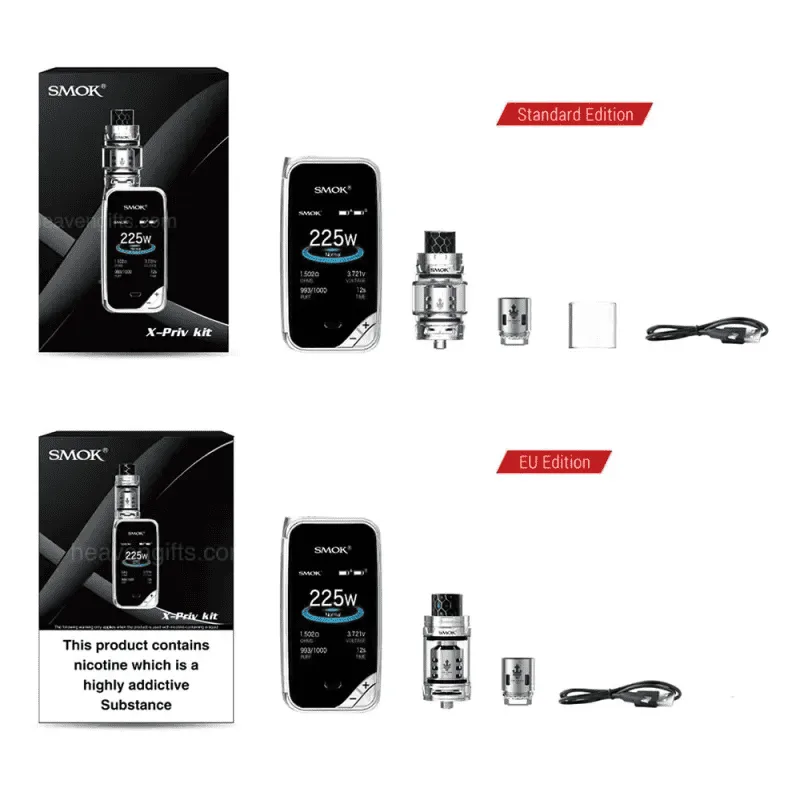 El Vaper Smok X Priv presenta una apariencia vidriosa con una pantalla HD masiva de 2.0 pulgadas, ¡que te brinda un toque suave con una textura excelente! Alimentado por baterías duales 18650 (no incluidas), el Vaper Smok X-Priv dispara hasta una potencia máxima de 225W.