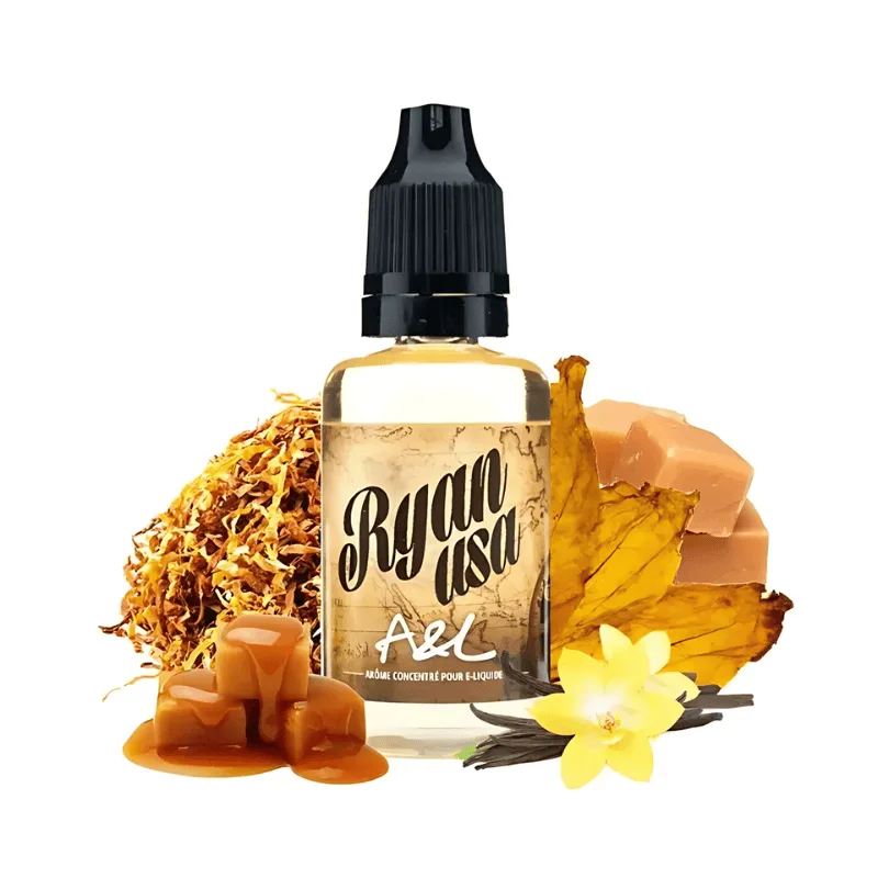 ¡Prueba el Aroma Ryan USA A&L! Auténtico sabor a tabaco rubio mezclado con caramelos y vainillas para un toque dulce y aromático. Capacidad de 30ml, dilución del 10% y maceración mínima de 5 días. No se puede vapear directamente, debe mezclarse con PV/VG. Origen francés.